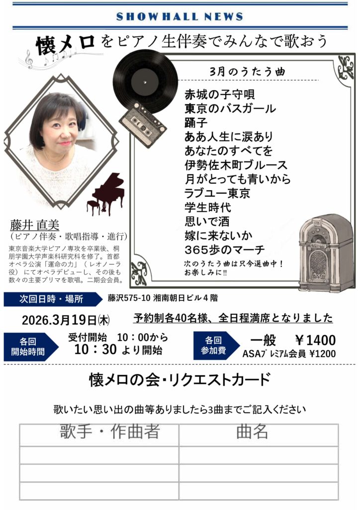 「懐メロをピアノ生伴奏でみんなで歌おう」⇒全日程満席